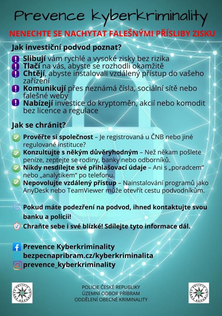 Podvodníci se stále častěji zaměřují právě na starší lidi, kdy využívají jejich důvěru, slušnost a snahu rychle vyřešit vzniklý problém. Jak se účinně chránit v konkrétních situacích naleznete v informačních letácích, které připravil komisař por. Mgr. Bc. Erik Navrátil z Oddělení obecné kriminality PČR Příbram.