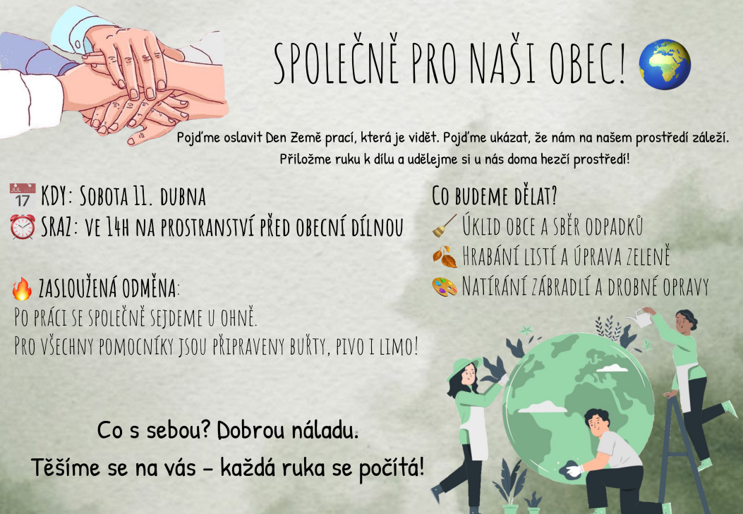 Přijďte v sobotu 11. dubna 2026 na prostranství před obecní dílnou a pomozte nám vytvořit hezčí prostředí pro všechny obyvatele.
